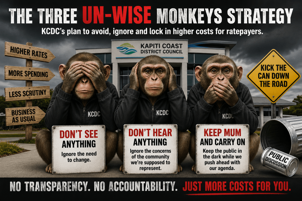 - Let’s kick the can down the road and put off public discussion about Council direction and expenditure until later in the year when we review the Long-Term Plan. That way in the meantime we can avoid public scrutiny of our annual plan for this year and the money we plan to spend, while we lock certain things in place………. for the 2026/27 year, and hopefully beyond.
