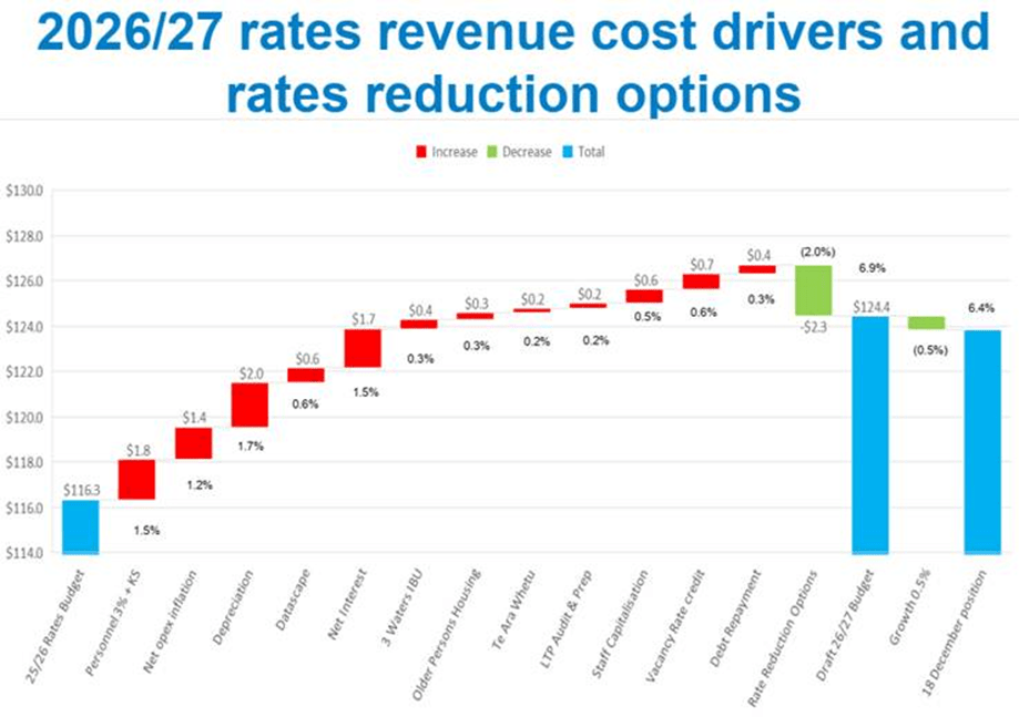 On 5th February 2026, members of Concerned Ratepayers Kapiti attended the Council’s briefing #3 on next year’s Annual Plan. (The public were excluded from Council briefings #1 and #2, where initial decisions were made behind closed doors). Although this sounds like a very dry topic, it’s actually the process by which KCDC sets its budget for the coming year, which in turn determines what the rates are going to be for next year. At the moment, it looks like next year’s rates increase will be between 5.7% and 6.4%, even though general inflation is just over 3%.